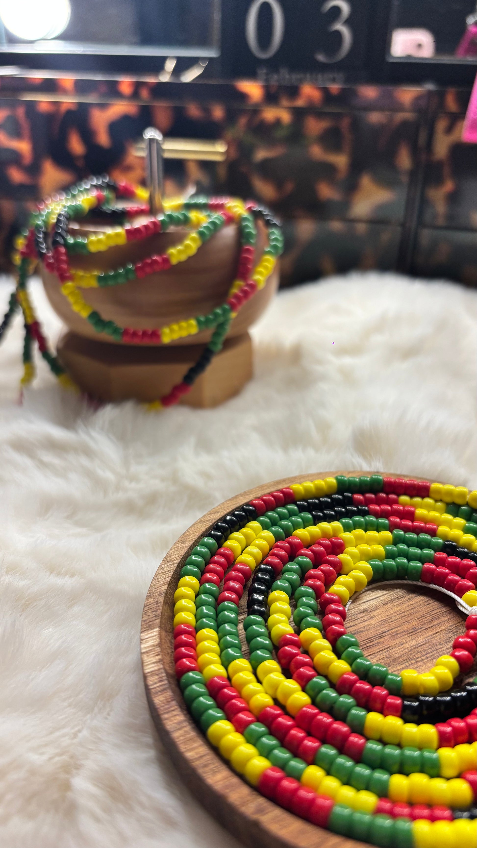 Legacy is a bold waist bead inspired by heritage, resilience, and generational pride. Featuring powerful tones of red, green, yellow, and black, this piece represents strength, unity, and the stories carried forward through time.