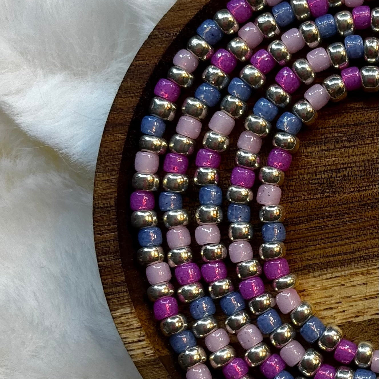 This waist bead set features a harmonious blend of blush pink, deep magenta, and muted denim blue seed beads, accented with polished metallic spacers for a subtle shimmer. The alternating color pattern creates a rhythmic, layered look that sits beautifully against the skin and complements both everyday wear and special occasions.